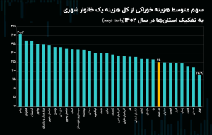 نسبت متوسط هزینه خوراکی به متوسط هزینه کل، بهعنوان شاخصی برای سنجش سطح رفاه خانوارها استفاده میشود. بهطوریکه اگر سهم هزینه خوراکیها افزایش یابد، نشاندهنده این است که خانوار بخش زیادی از بودجه خود را صرف خوراکی کرده و سهم کمتری را برای گروه غیرخوراکی و خدمات کنار گذاشته است. زمانی که سطح رفاه خانوارها بالا باشد، آنها تمایل دارند هزینه بیشتری برای کالا و خدمات غیرخوراکی بپردازند. برعکس، در صورتی که سطح رفاه پایین باشد، خانوارها بیشتر تلاش میکنند نیازهای ضروری و پایهای خود را تأمین کنند که عمدتاً شامل خوراکیهاست. دادههای مرکز آمار ایران از متوسط درآمد و هزینه خانوارها در سال ۱۴۰۲ نشان میدهد که یک خانوار شهری به طور متوسط ۵۱ میلیون و ۴۷۶ هزار تومان برای خورد و خوراک هزینه کرده است. در استان یزد، متوسط هزینه اقلام خوراکی یک خانوار شهری حدود ۲۷ درصد از کل مخارج بوده که این استان را از نظر سطح رفاه، در جایگاه هفتم کشور قرار داده است.